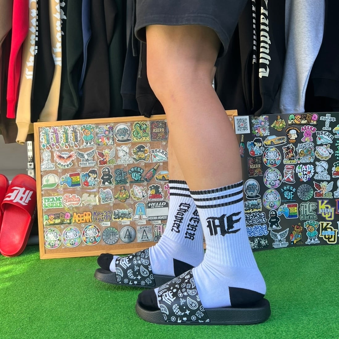 モノトーンカラーのロゴソックス。オールドイングリッシュでかっこよく締まるデザイン。甲にはアクセントカラーとなるロゴを施し、シューズを脱いだ時に現れる仕様。